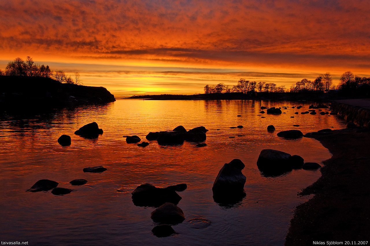 Helsinki: Auringonlasku kuvattuna Uunisaarensalmen suulta Kaivopuistonrannasta. Vasemmalla näkyvän Harakan saaren ja oikealla näkyvien Uunisaarten välissä on Uuninsuun salmi.
