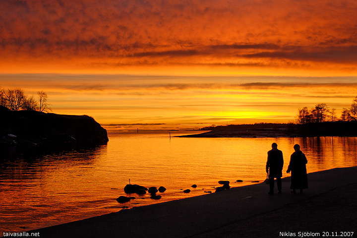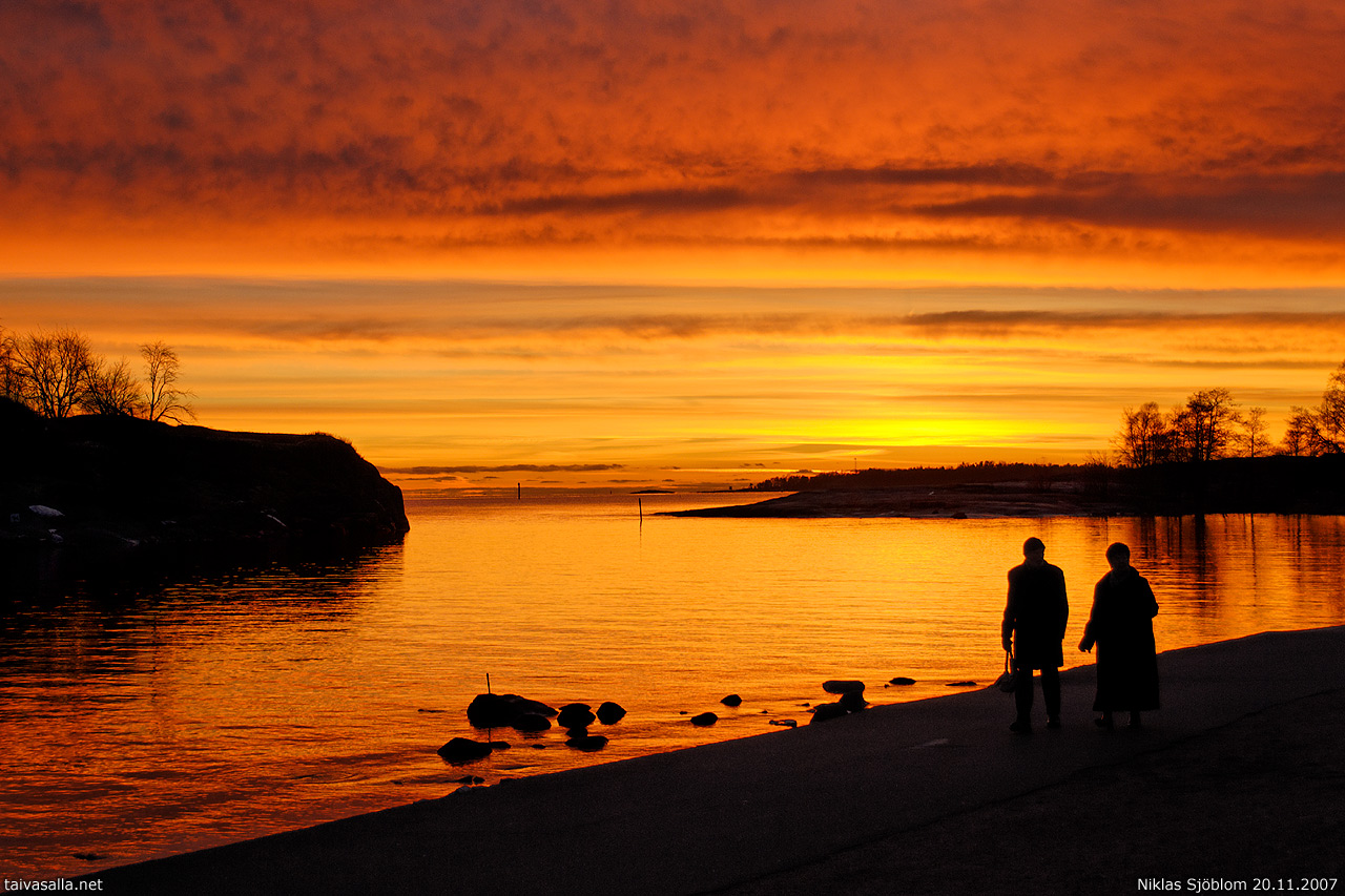 Helsinki: Auringonlasku kuvattuna Uunisaarensalmen suulta Kaivopuistonrannasta. Vasemmalla näkyvän Harakan saaren ja oikealla näkyvien Uunisaarten välissä on Uuninsuun salmi.