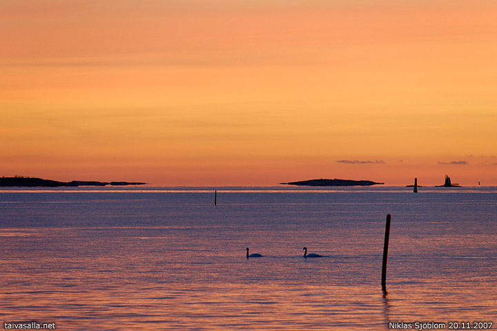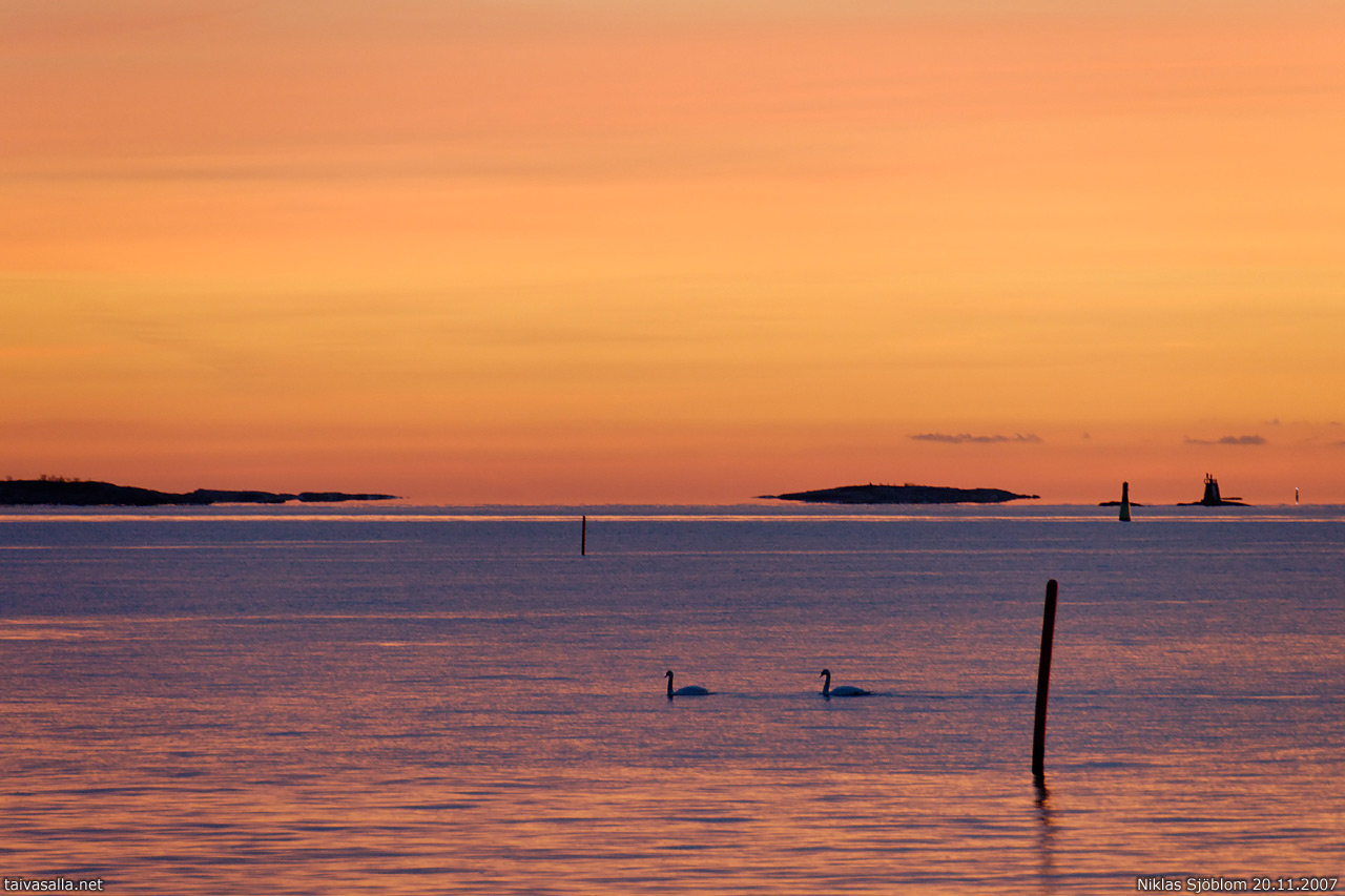 Helsinki: Kyhmyjoutsenia Uunisaarten eteläpuolella Ullanlinnan edustalla auringonlaskun jälkeen.
