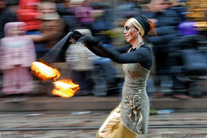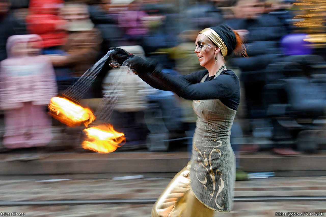 Helsinki: Tulitaiteilija joulukadun avajaiskulkueessa Aleksanterinkadulla.