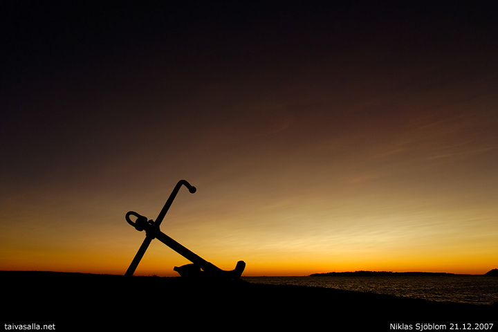 Helsinki: Helmiäispilvet hohtavat Suomenlahden yllä auringonlaskun jälkeen Liuskasaaresta Ullanlinnan edustalta kuvatussa lounaisnäkymässä. Stratosfäärissä sijaitsevat helmiäispilvet ovat tavanomaisia pilviä korkeammalla ilmakehässä, joten laskeva aurinko valaisee niitä pitempään. Pilvet näkyvät myös seuraavassa kuvassa, jossa ne erottuvat vielä selvemmin. Kuvassa oleva ankkuri on kuvattu hieman erilaisissa olosuhteissa 28.3.2006.