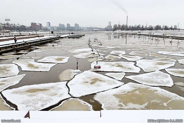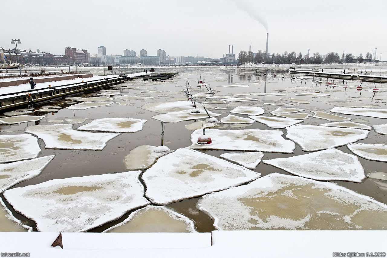 Helsinki: Sulavat jäälautat ajelehtivat Laivastopuiston lähettyvillä sijaitsevien laitureiden ja poijujen välissä Katajanokan pohjoispuolella leutona päivänä.