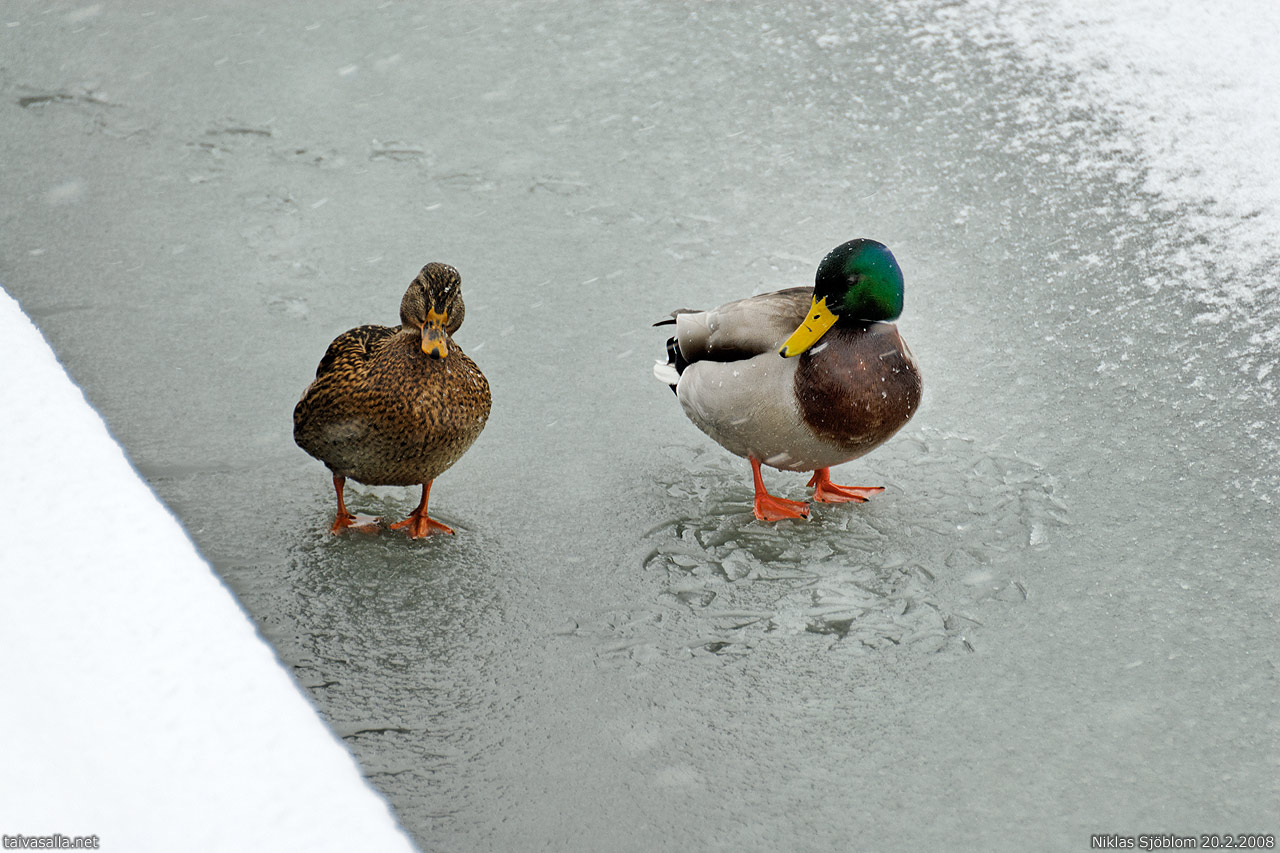 Herra ja rouva Sorsa ovat päiväkävelylllä jäällä. Yllättiköhän tämä jäännöstalvi sorsatkin, kun tuli lunta ja pakkasta. Rauhallinen tunnelma tässä, ei ole kiirettä mihinkään.