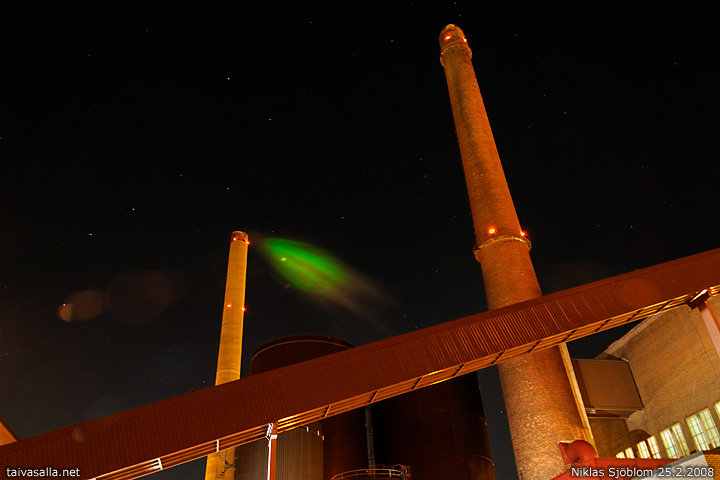 Helsinki: Salmisaaren kivihiilivoimalaitos savupiippuineen ja energian kulutukseen reagoiva Vihreä pilvi -laserteos B-voimalaitoksen höyrypilvessä. Tallberginkadun puolelta otetussa kuvassa vasemmalla erottuu Otavan tähtikuvio.