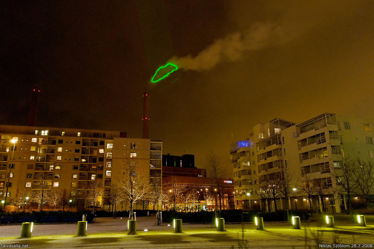 Helsinki: Vihreä pilvi -laserteos Salmisaaren kivihiilivoimalaitoksen höyrypilvessä Ruoholahdessa. Energian kulutuksen pienentyessä kokoansa vastaavasti kasvattanut, höyrypilven ääriviivoja seurannut laserprojektio on tässä kuvattu Kaapelitehtaan kulmalla sijaitsevan Kaapelipuiston laidalta. Kaapelitehtaan ikkunasta tuleva lasersäde erottuu heikosti vihertävänä suorakaiteena taivaalla vihreän höyrypilven yläpuolella.