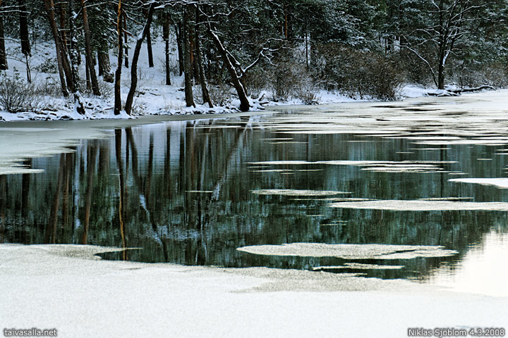 Helsinki: Kallahdenharjun luonnonsuojelualueen länsirantaa ja Ison Kallahden osittain jäätynyttä vedenpintaa Vuosaaressa.