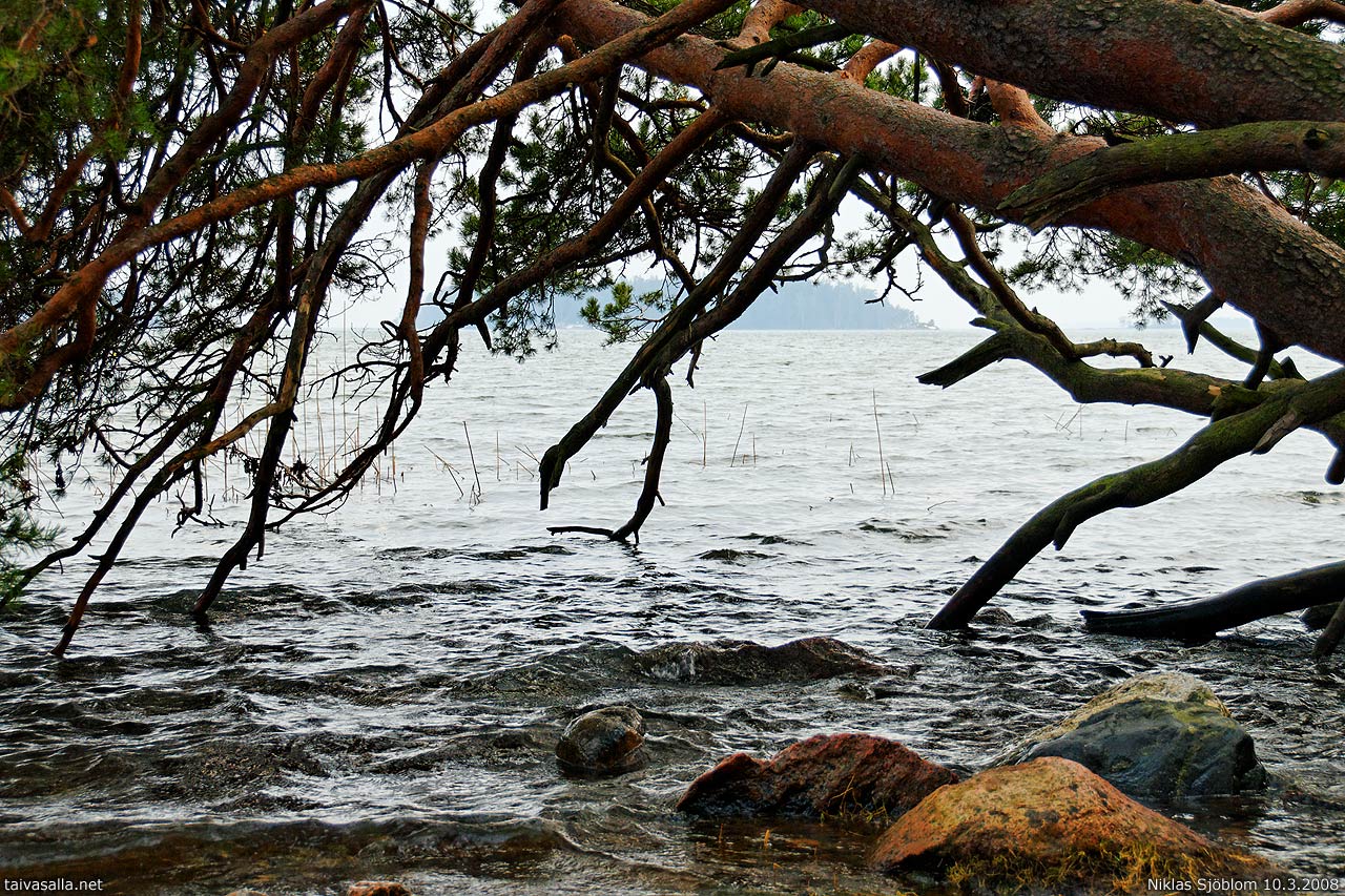 Espoo: Veden ylle kallistunut mänty Espoon Karhusaaressa. Taustalla erottuva saari lienee Korkeasaari, joka on yksi Espoon kaupungin ulkoilualueista.