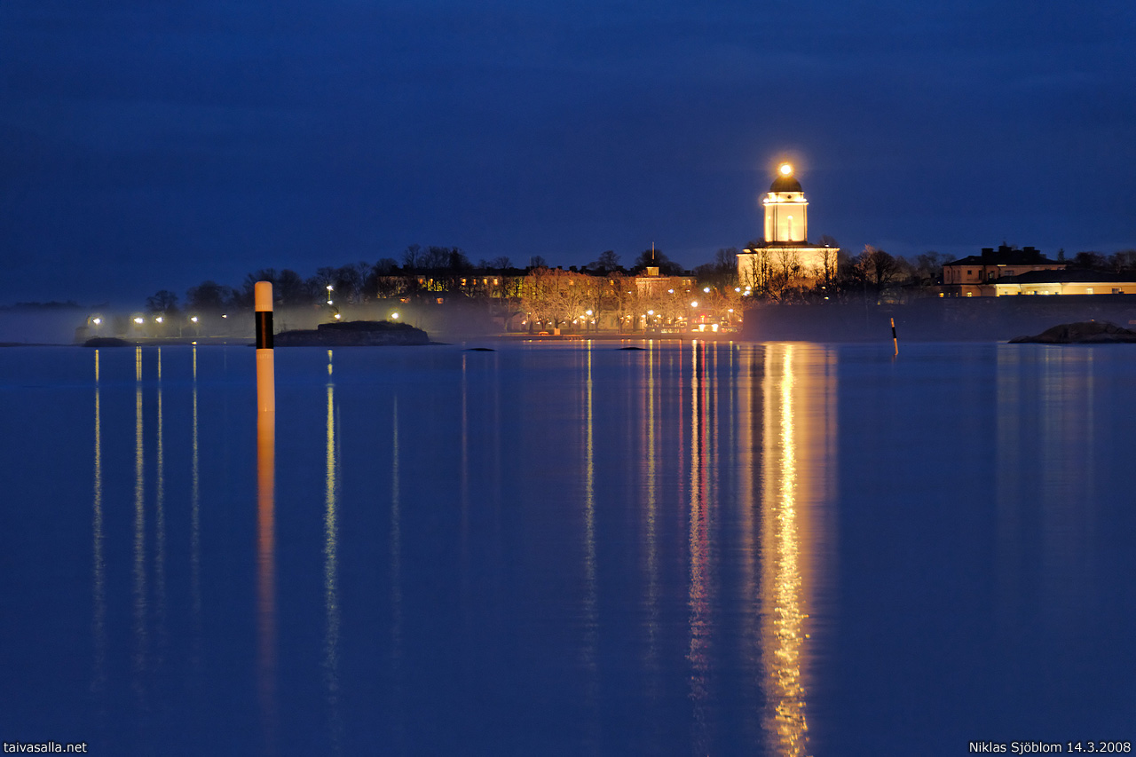 Helsinki: Suomenlinnan valot heijastuvat Kruunuvuorenselän tyynestä vedestä iltahämärissä. Ehrenströmintieltä Kaivopuistosta otetussa kuvassa näkyy myös hälvenevän sumun rippeitä.