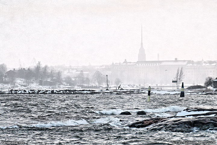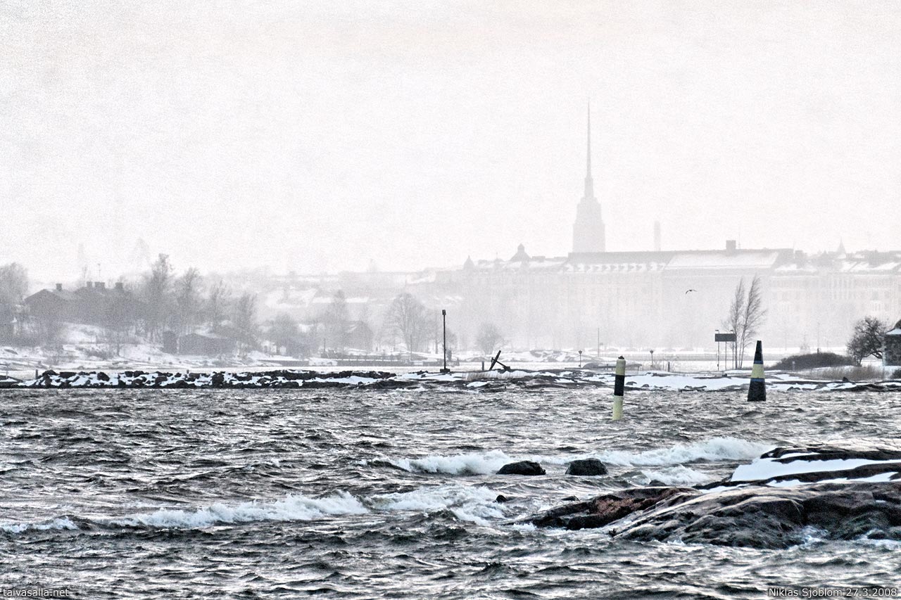 Helsinki: Paikallisen lumikuuron sävyttämä näkymä Suomenlinnan Länsi-Mustasaaresta. Särkänsalmen ja Särkän aallonmurtajan takana vasemmalla näkyy Harakan saari, ja taustalla Ullanlinnan rakennusten yllä kohoaa Mikael Agricolan kirkon torni.