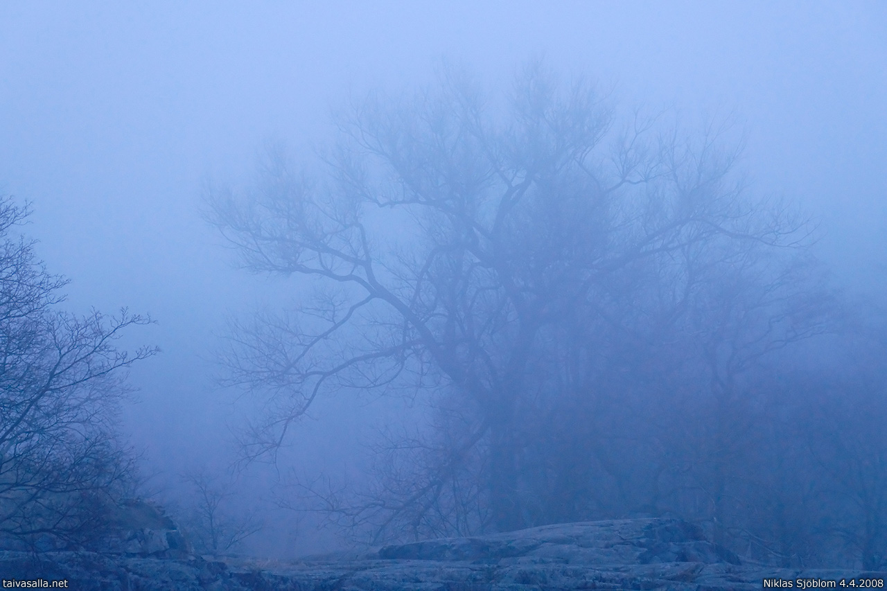 Helsinki: Mereltä ajautunut sumu kietoi Kaivopuiston sinertävään huntuunsa iltahämärissä.