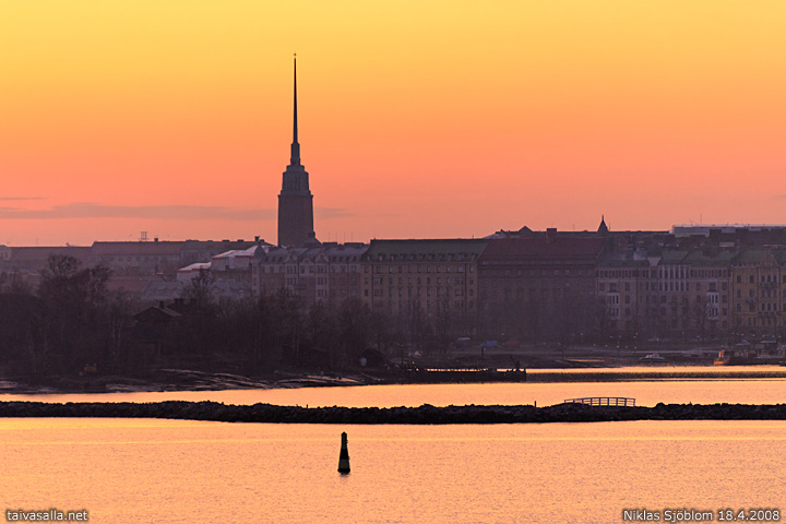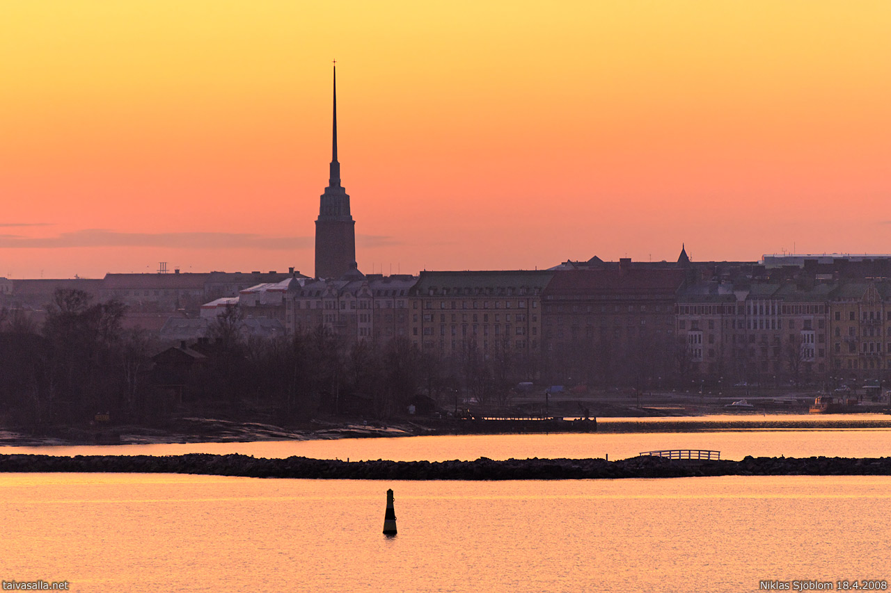 Helsinki: Auringonlaskun aikaan kuvattu näkymä Suomenlinnan Susisaaresta kohti Merisatamaa, Ullanlinnaa ja takana Punavuoressa kohoavaa Mikael Agricolan kirkon tornia. Vasemmalla erottuu Harakan saari, jonka edessä näkyy Särkän aallonmurtaja siltoineen ja Särkänsalmi.