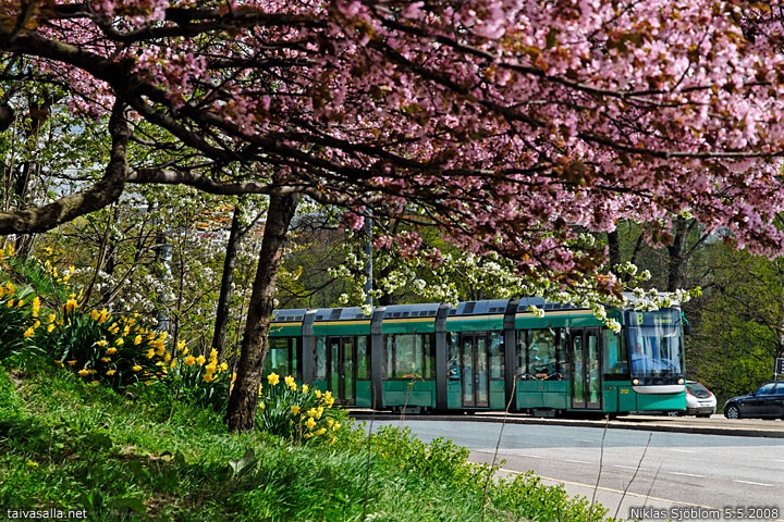 Helsinki: Helsinginkatua kulkeva ratikka kuvattuna Mäntymäen kukkivan kirsikkapuun alta. Taka-Töölön Mäntymäkeä keväisin koristava rusokirsikkapuu on kuvattu kokonaisuudessaan 21.5.2003.