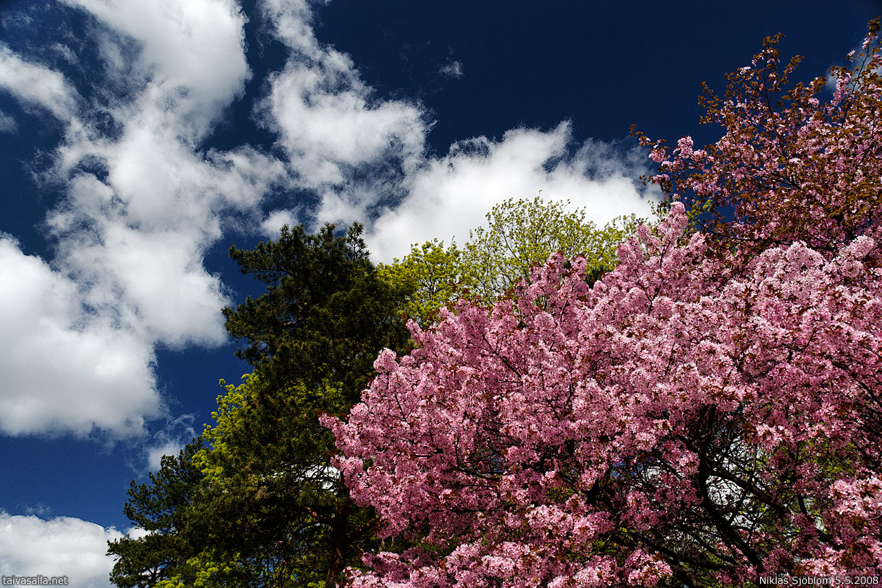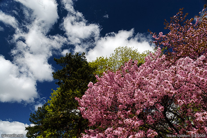 Helsinki: Kukkiva rusokirsikkapuu ja muita puita Mäntymäellä Helsinginkadun varrella Taka-Töölössä. Sama kirsikkapuu on kuvattu kokonaisuudessaan 21.5.2003.