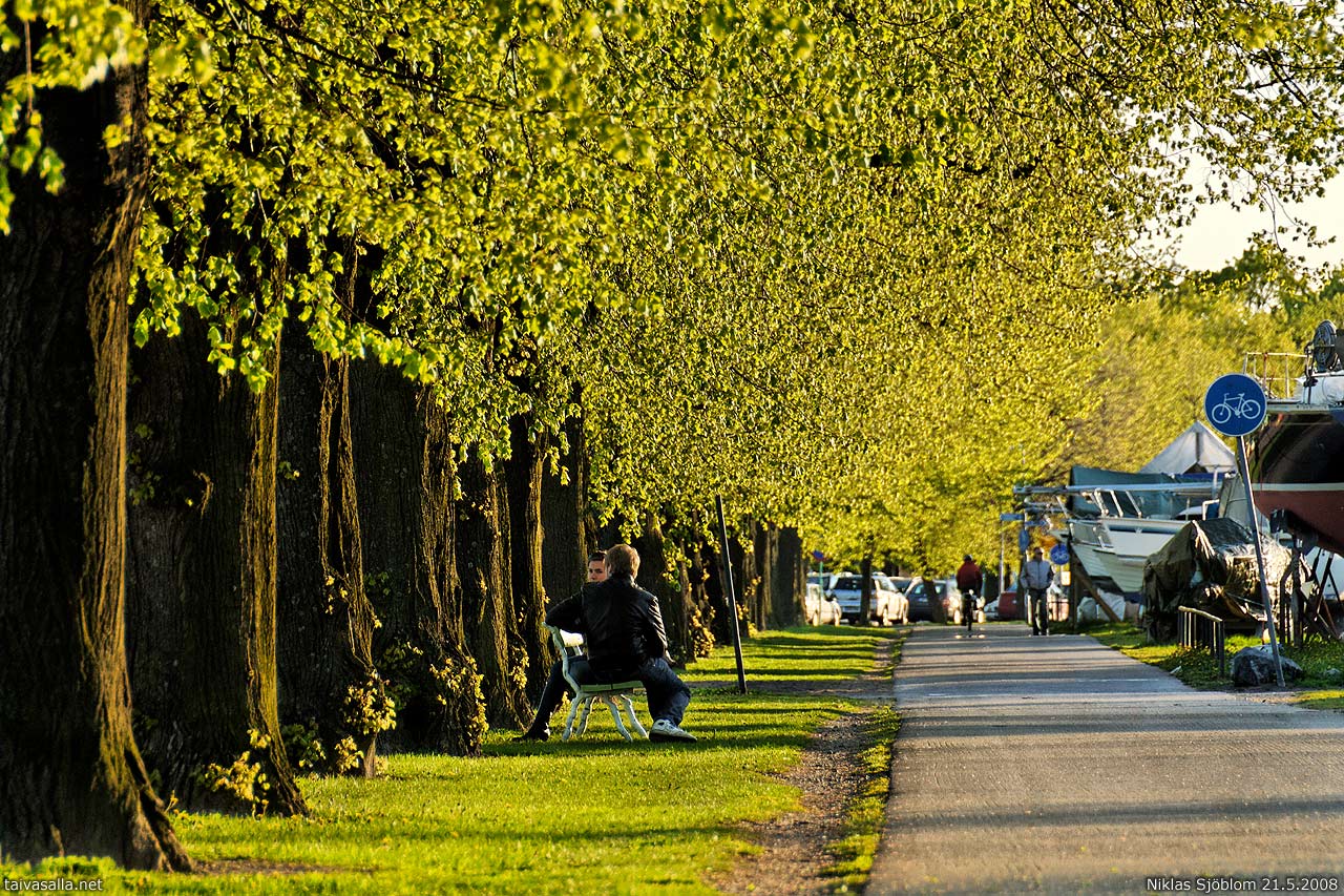 Helsinki: Merisatamanrannan pyörätie Ullanlinnassa ilta-auringon valossa.
