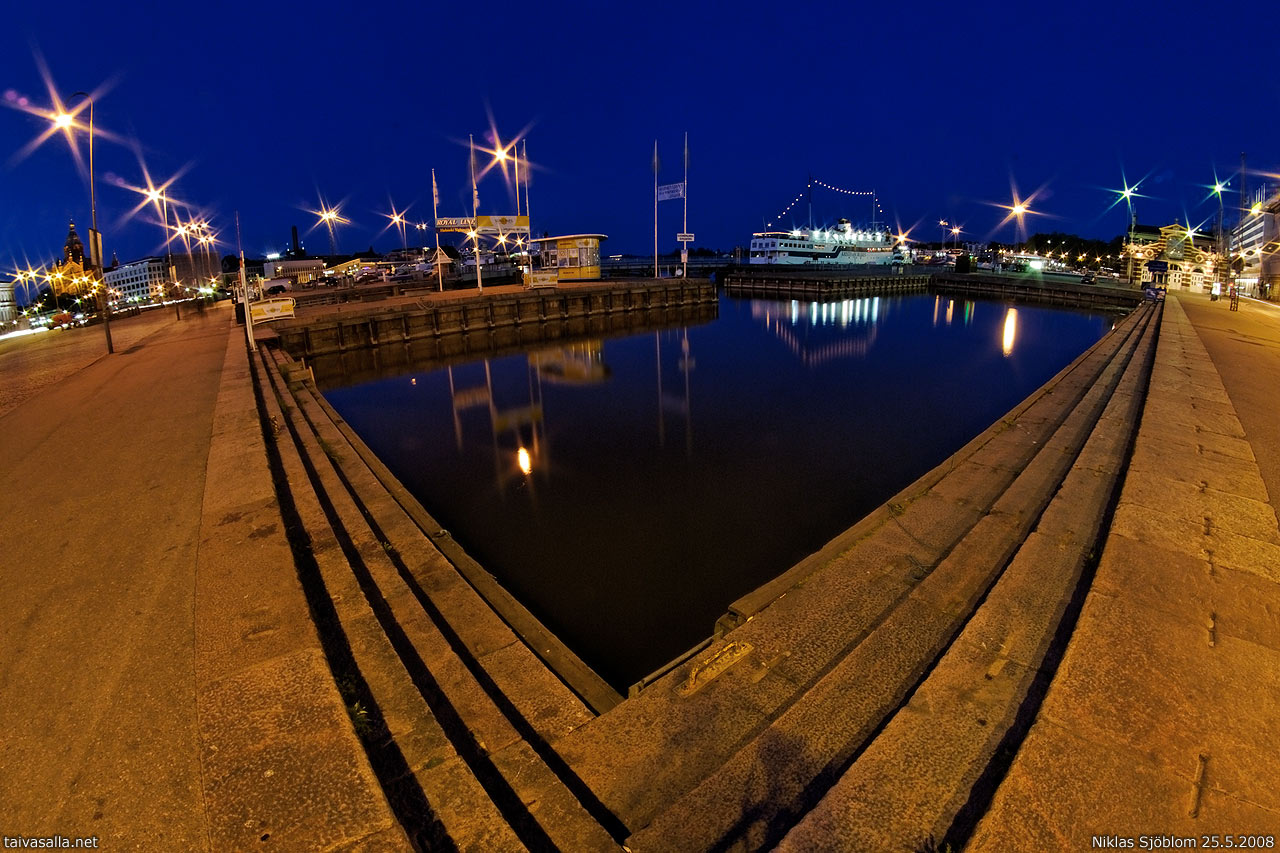 Helsinki: Kolera-allas Kauppatorin reunalla kevätyön hämärissä.