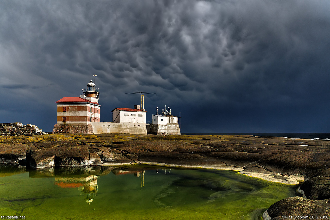 Märket, Ahvenanmaa/Ruotsi: Synkkiä pilviä Märketin majakan yllä, osa 5. Neljäs päiväni Suomen ja Ruotsin rajalla Ahvenanmerellä sijaitsevalla majakkaluodolla tarjosi huikeita pilvinäytelmiä ja äärimmäisiä sääilmiöitä kirkkaasta auringonpaisteesta ukkosen sävyttämään rankkasateeseen. Kuvassa keskellä näkyviä pilviä kutsutaan utarepilviksi eli mammatuspilviksi.