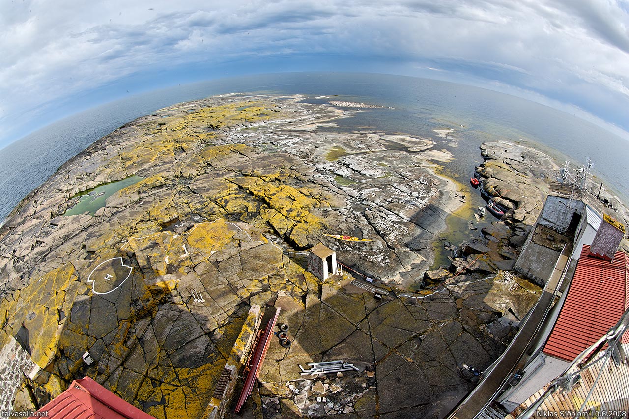 Märket, Ahvenanmaa/Ruotsi: Ahvenanmerellä sijaitseva Märketin majakkaluoto kuvattuna majakan tornista kalansilmälinssin läpi. Suomen ja Ruotsin välinen erikoisen muotoinen valtakunnanraja halkaisee luodon siten, että edustalla olevat majakkarakennukset ja taustalla näkyvä ranta ovat Suomen puolella, mutta vasemmalla näkyvä lammikko ja osa oikealla olevaa lahdenpoukamaa ovat Ruotsissa. Kuva on otettu kohti Suomea.