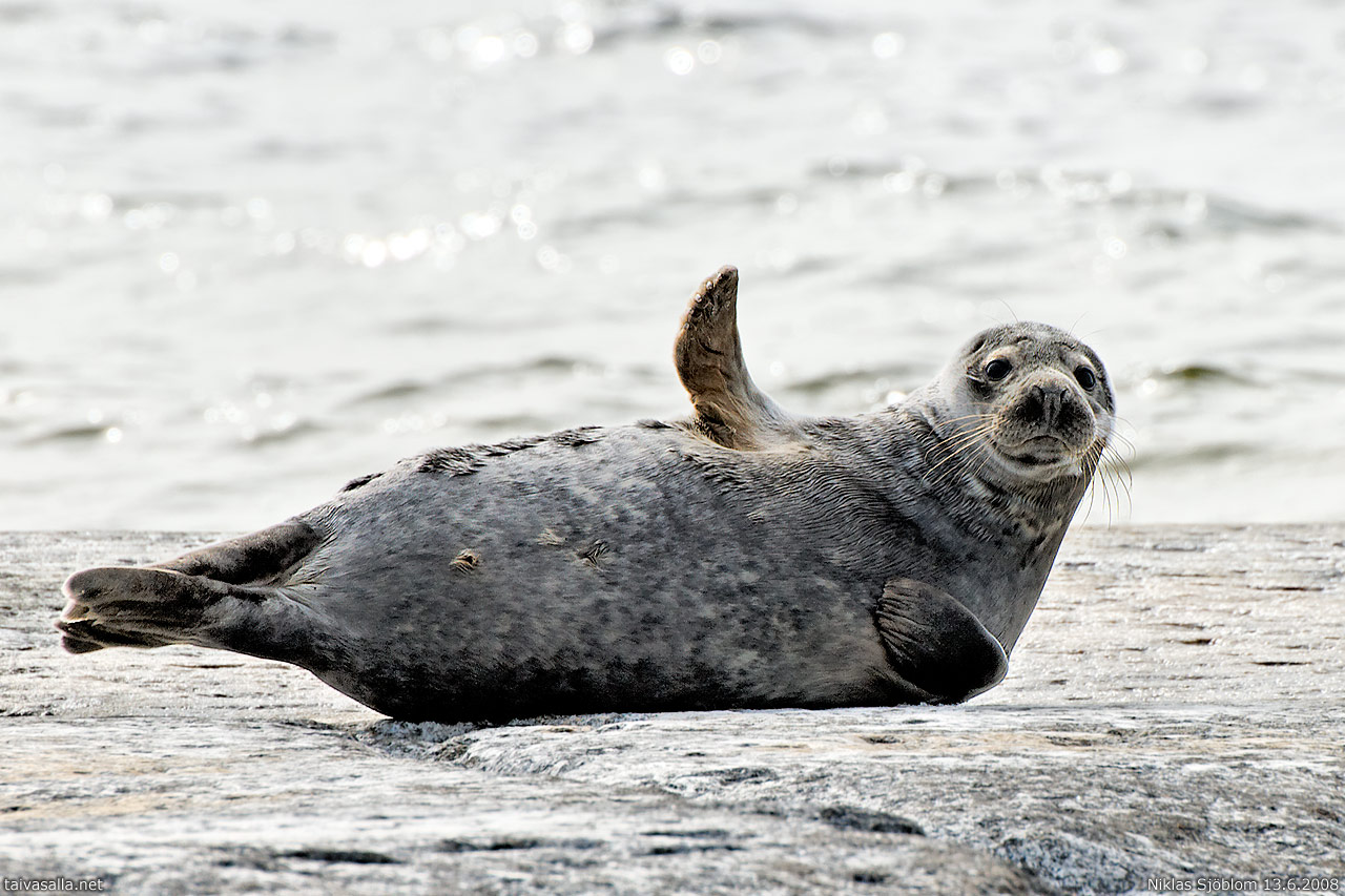 Märket, Ahvenanmaa/Ruotsi: Harmaahylje vilkuttaa kuvaajalle kuvauksen päätteeksi Suomen ja Ruotsin rajalla Ahvenanmerellä sijaitsevalla Märketin majakkaluodolla. Tämä pitkään rantakalliolla köllötellyt hylje poseerasi kameralle myös edellisissä kuvissa.