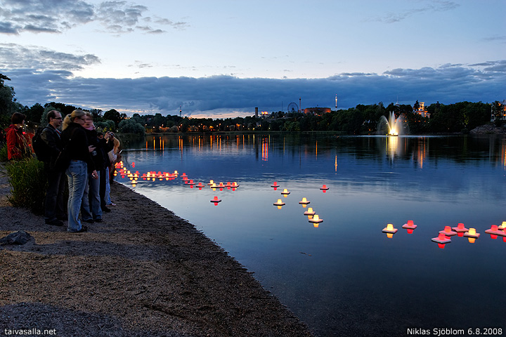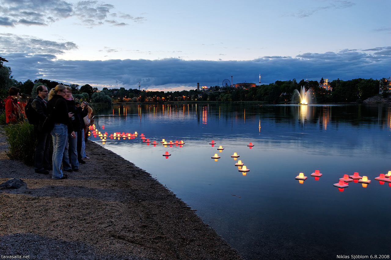 Helsinki: Hiroshiman ja Nagasakin uhrien muistoksi sytytetyt kynttilälyhdyt kelluvat pimenevällä Töölönlahdella vuosittain vietettävänä Hiroshima-iltana.