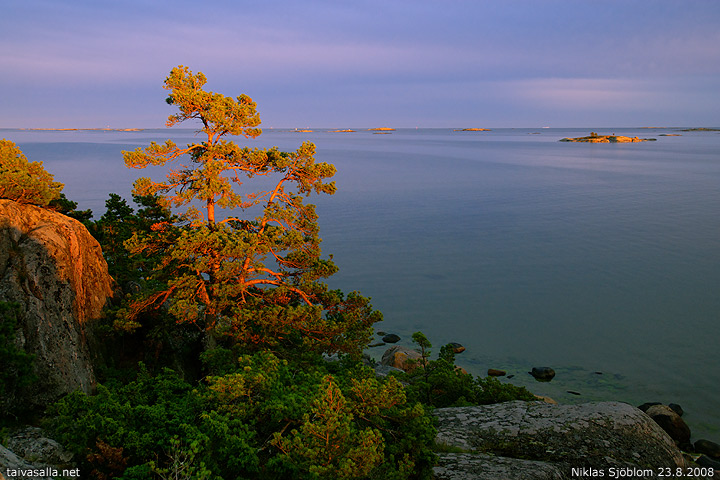Hanko: View from the southern cliffs of Högholmen headland in Tvärminne, about 10 kilometres east of the city of Hanko in the southernmost part of Finland. Photo taken soon before sunset, when the last sunshine of the day glowed in the landscape.