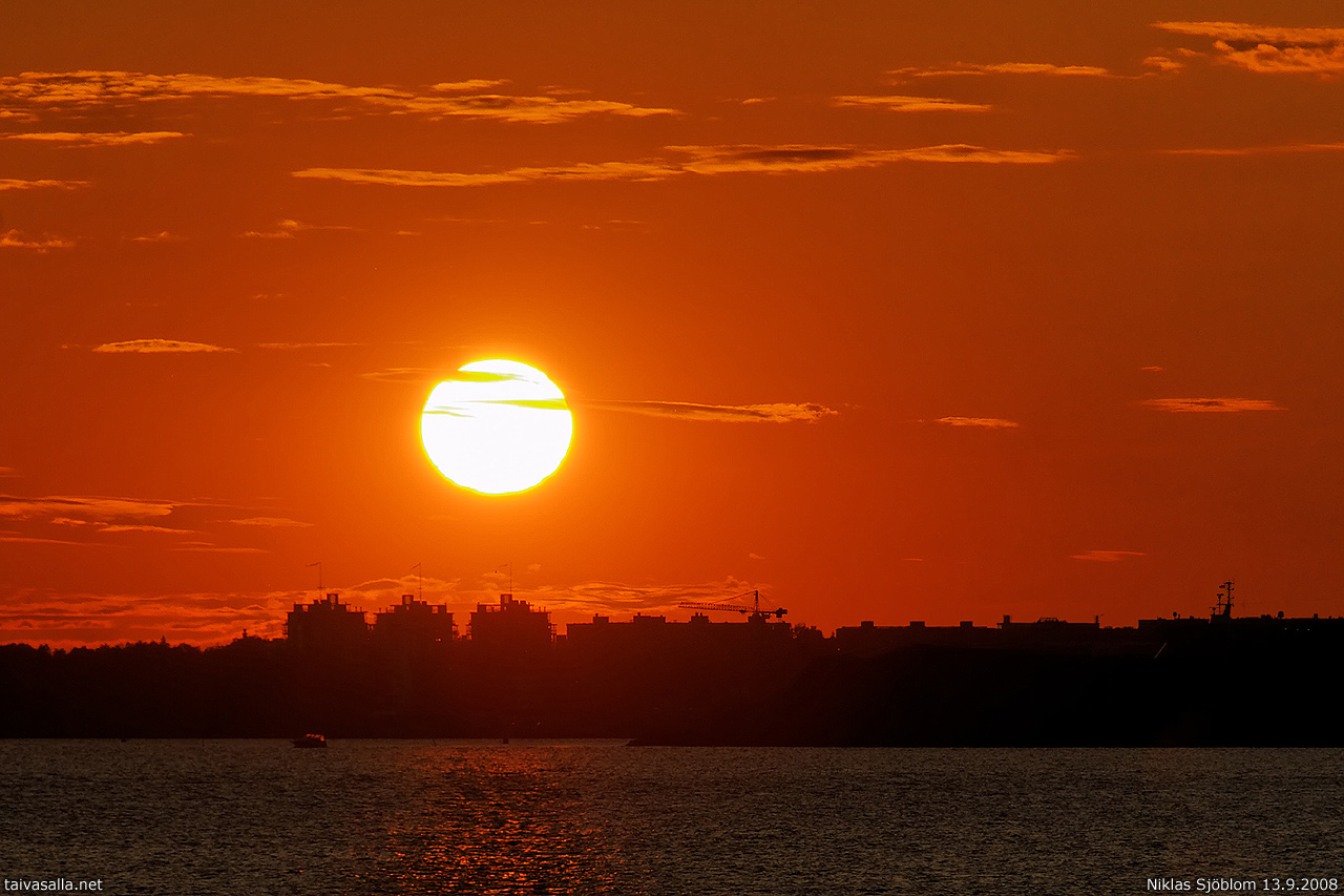 Helsinki: The setting sun glows above the sea area of Lauttasaarenselkä and some residential buildings in the district of Lauttasaari. Picture taken 11 minutes before sunset from Susisaari, one of the Suomenlinna sea fortress islands.
