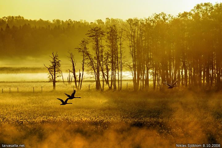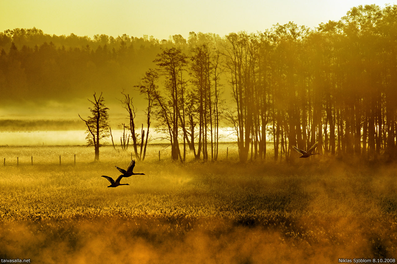 Helsinki: Three swans on their wings above Viikki-Vanhankaupunginlahti nature reserve on a cold autumn morning.