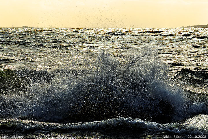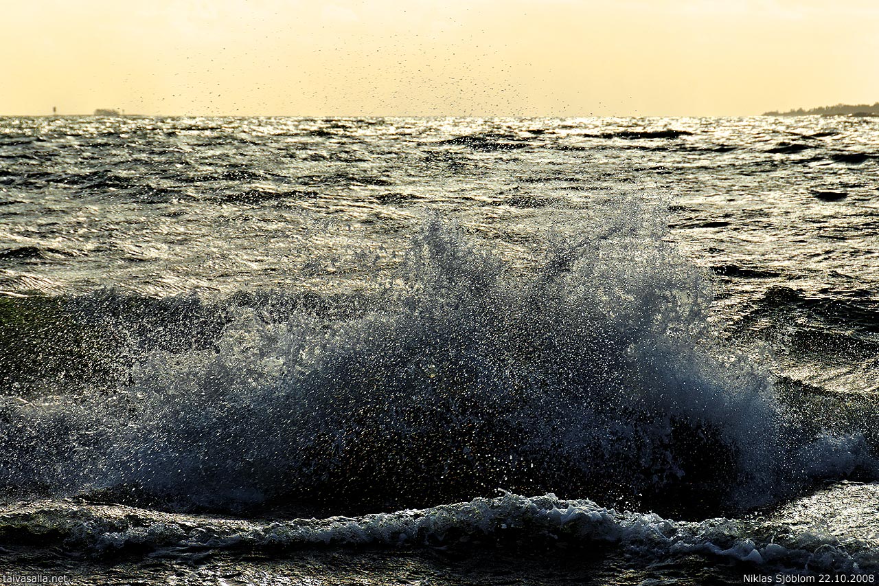 Helsinki: Aallot murtuvat pärskeiksi Takaniemen rannassa Lauttasaaressa tuulisena syyspäivänä.