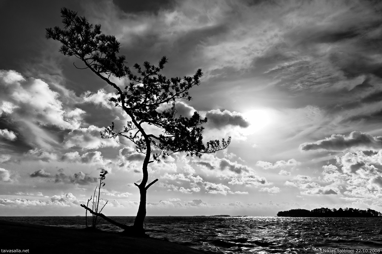 Helsinki: Sinnikäs pikkumänty Länsiulapanniemen rannassa Lauttasaaressa tuulisena syyspäivänä.