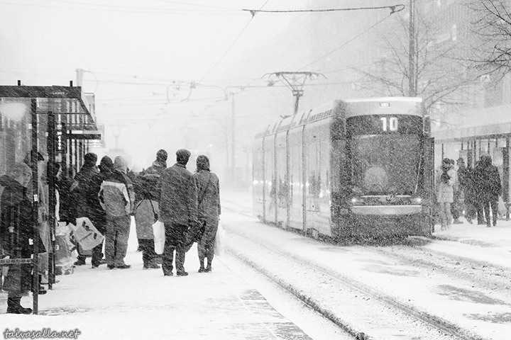 Helsinki: Kaupunki lumimyräkän kourissa, osa 5. Lasipalatsin raitiovaunupysäkki Mannerheimintiellä kuvattuna Postikadun risteyksestä.