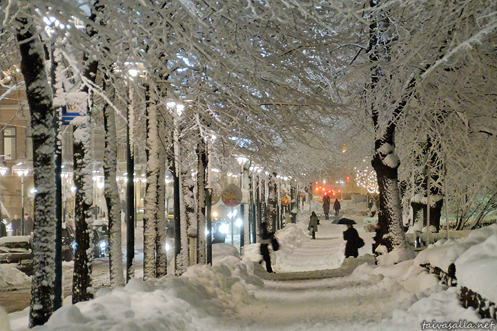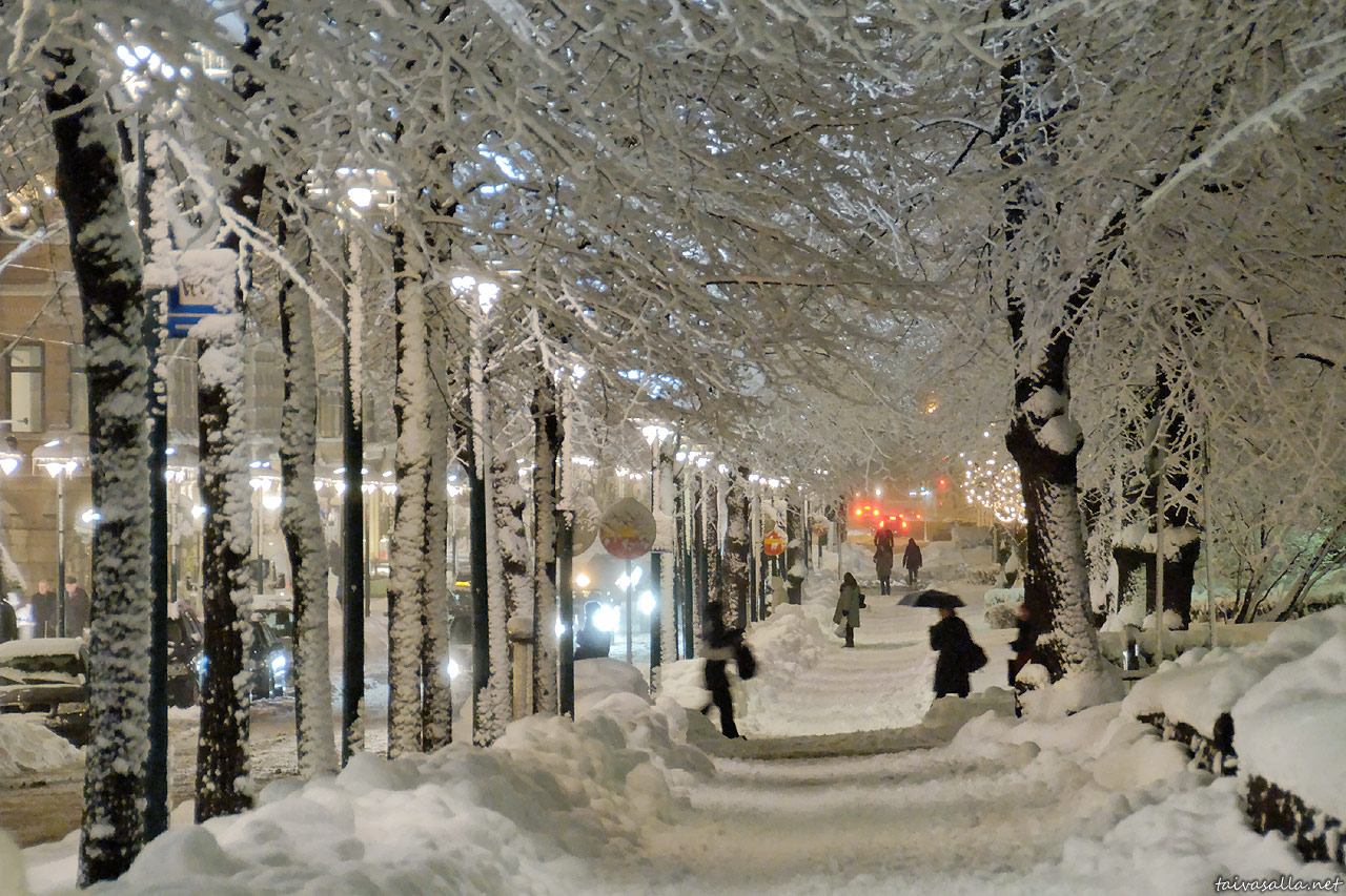 Helsinki: Kaupunki lumimyräkän jälkeen, osa 8. Talvinen näkymä pitkin Pohjoisesplanadia Ruotsalaisen teatterin takaa kohti Kauppatoria.