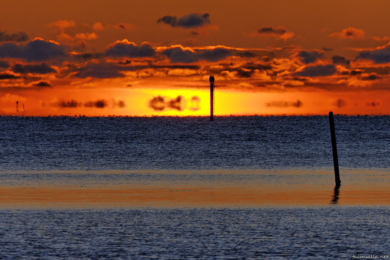 Helsinki: Sunset and a mirage in the horizon above the Gulf of Finland seen from the shore of Kaivopuisto district. The radar reflector in the middle can be seen in my photos taken on 17 March 2006 and 26 February 2006.