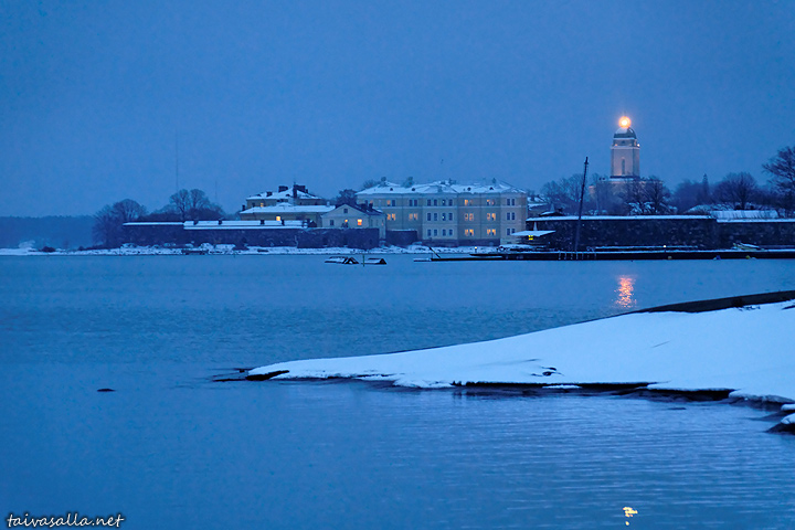 Helsinki: Islands of the Suomenlinna sea fortress seen from a pontoon bridge connecting Kaivopuisto district with the Uunisaari islands, a small part of which is seen in the front.