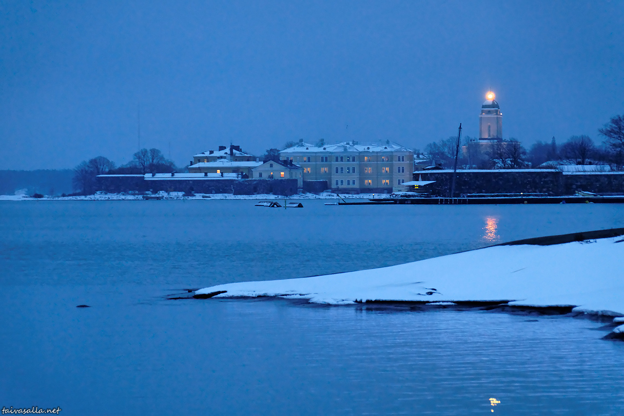 The warmth coming from the lit windows makes the sea and snow seem really cold - made me shiver.