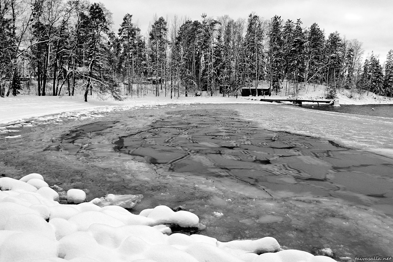 Helsinki: A small bay covered with ice and snow in the southwestern part of Lauttasaari district. Even in reality the ice floes in the bay looked like pasted from a blurred picture.
