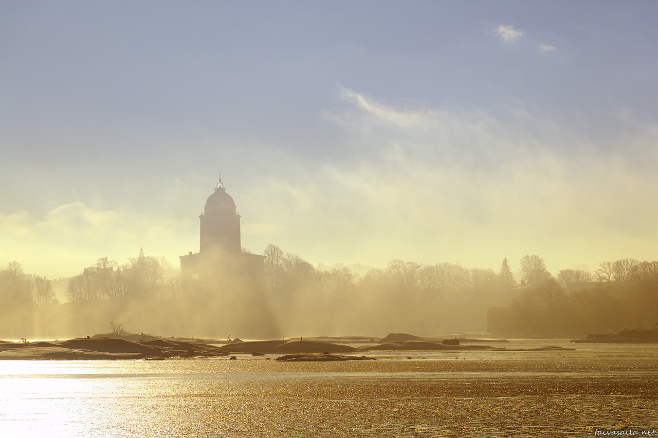 Helsinki: Merisumu syleilee Suomenlinnaa kylmänä ja tyynenä talviaamuna Eteläsataman edustalta kuvatussa näkymässä.