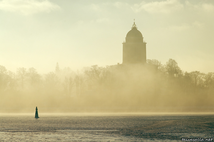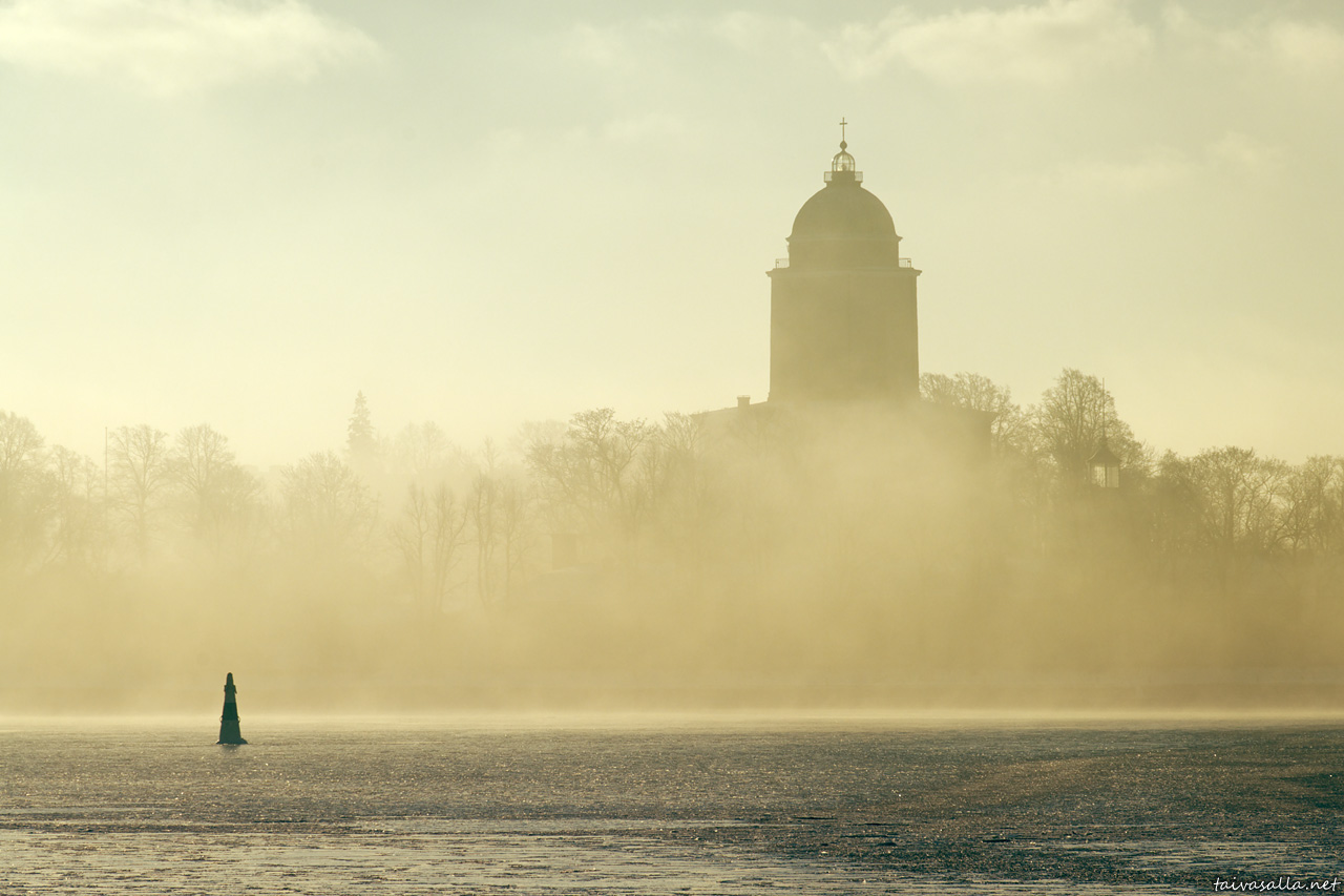 Helsinki: Suomenlinnan Iso Mustasaari ja siellä kohoava kirkko merisumun syleilyssä. Kuvattu kylmänä ja tyynenä talviaamuna Suomenlinnan lautalta Kruunuvuorenselältä.