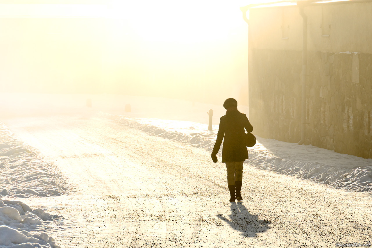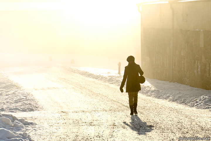 Helsinki: Kulkijan tie käy kohti talviaamun valoa Isossa Mustasaaressa Suomenlinnassa.