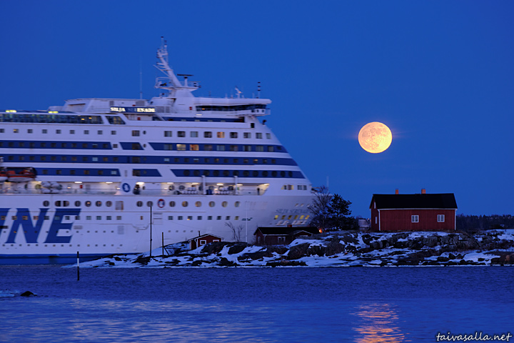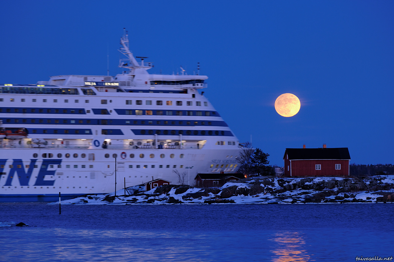 Helsinki: Täysikuu nousee Eteläsataman edustalla sijaitsevan Ryssänsaaren yllä Silja Serenaden suunnatessa kohti Tukholmaa. Kuva on otettu Ehrenströmintien varrelta Kaivopuiston rannasta.