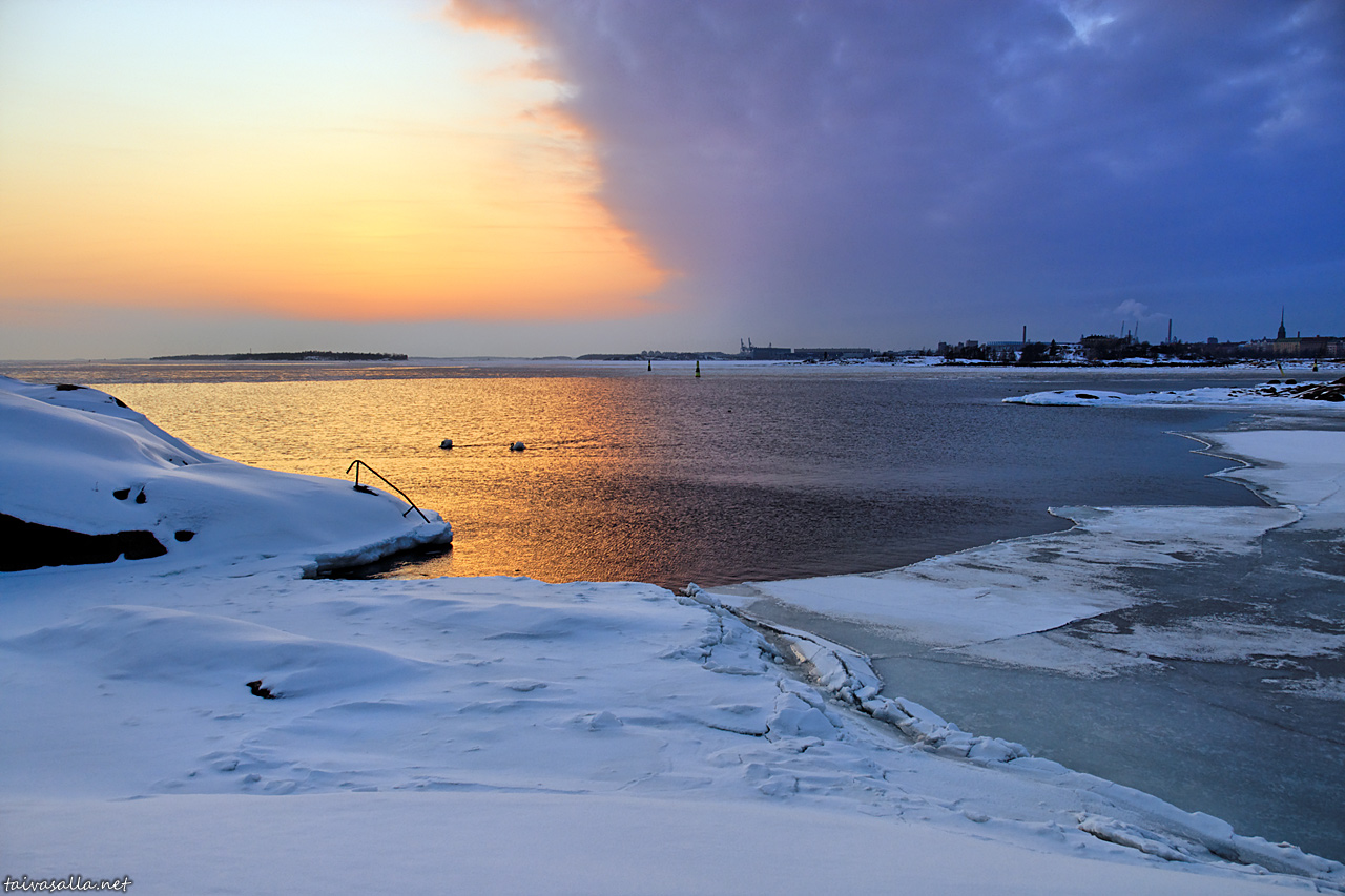 Helsinki: Osittain jäätynyttä merta ja osittain selkeää taivasta auringonlaskun aikaan Suomenlinnan Länsi-Mustasaaresta kohti Lauttasaarenselkää kuvatussa näkymässä.