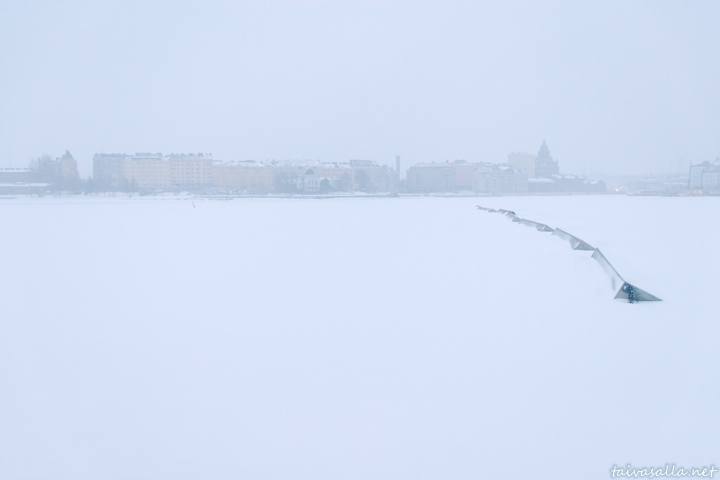 Samoilla linjoilla Aiun kanssa. Niin lähellä, mutta niin kaukana. Edessä upottavaa lunta ja usvaa. MUTTA: näenkös pienen valonpilkahduksen tuolla kuvan oikealla laidalla? Eipäs olekaan kuollut kaupunki!