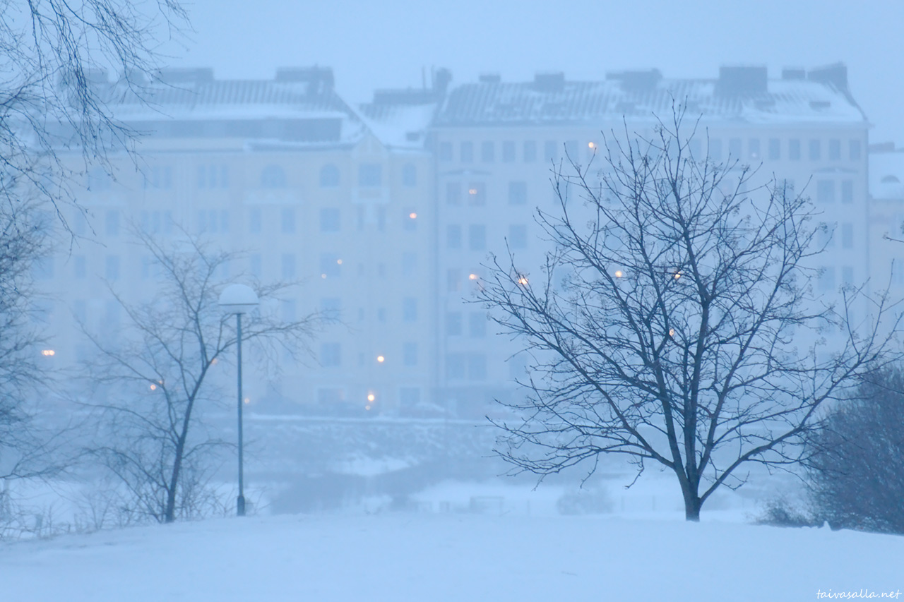 Helsinki: Hämärtyvän talvi-illan näkymä Tervasaaresta kohti Katajanokan Laivastokatua.