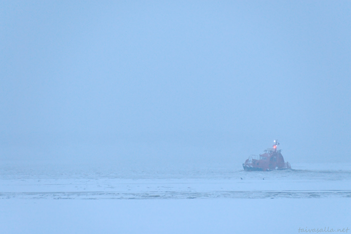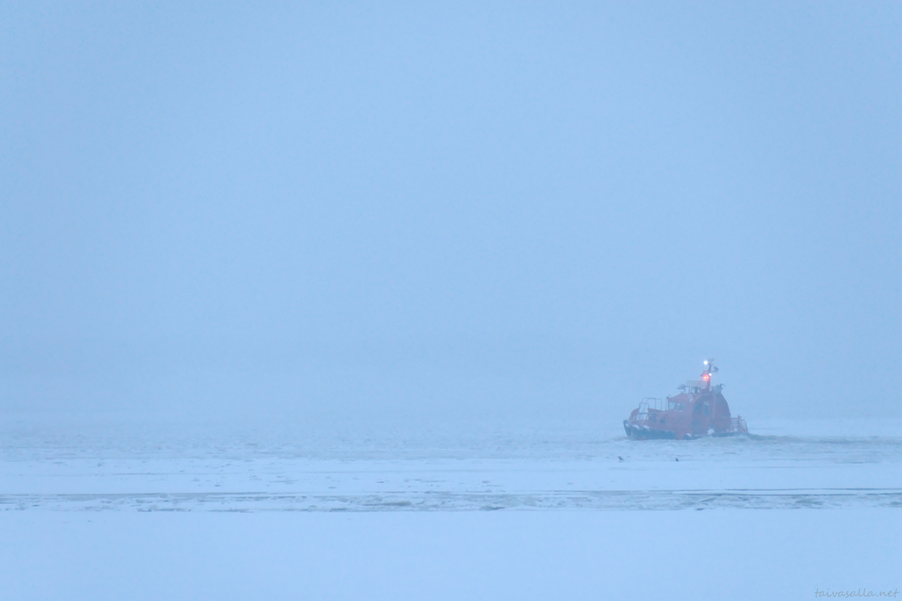Luotsit on kovia jätkiä, ja niin on Niklaskin, kun rämpii tuolla ulkona kelillä kuin kelillä. Ihana sininen tunnelma kuvassa.