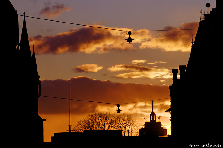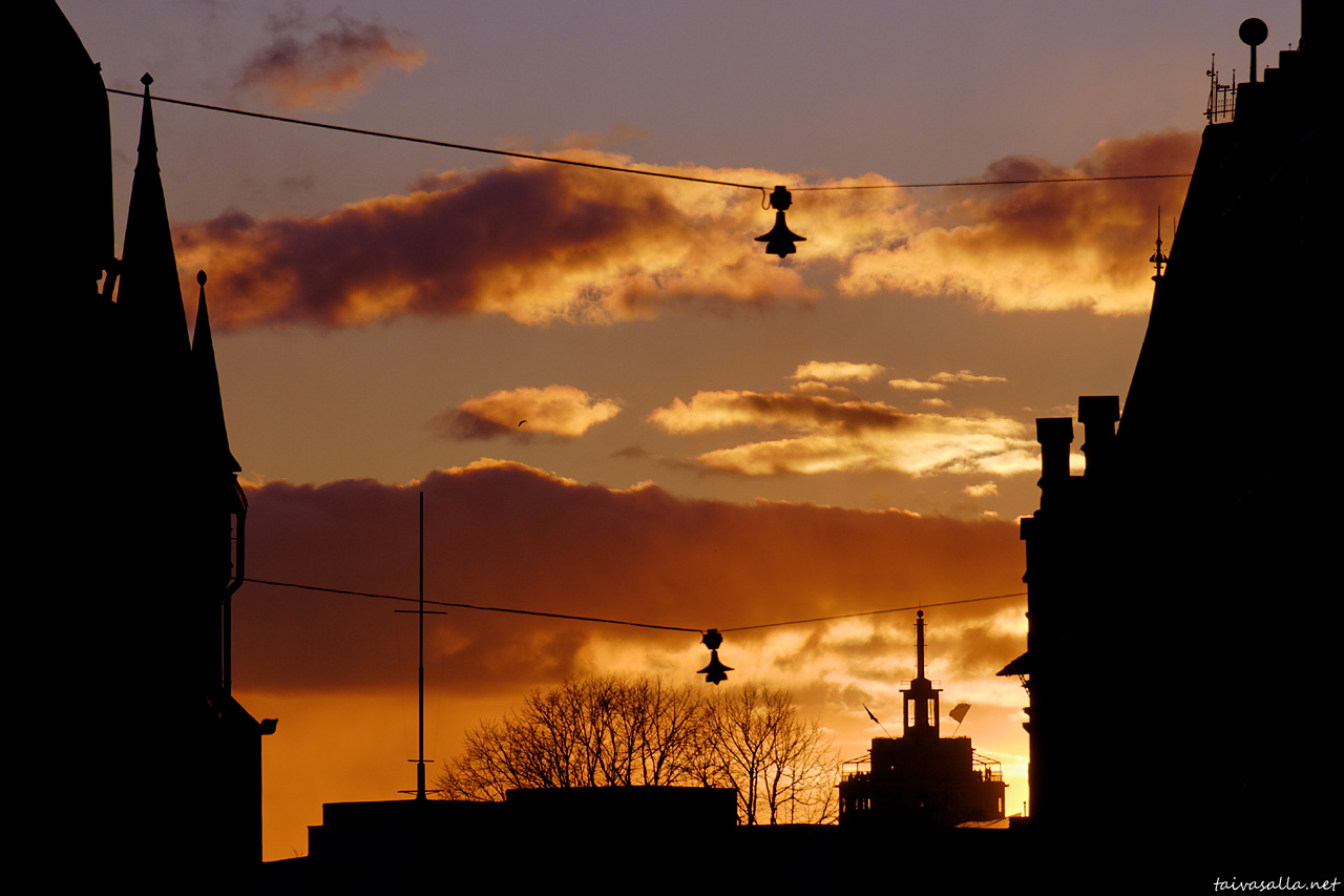 Mahtavasti piirtyy talojen siluetit taivasta vasten. Taideteos!