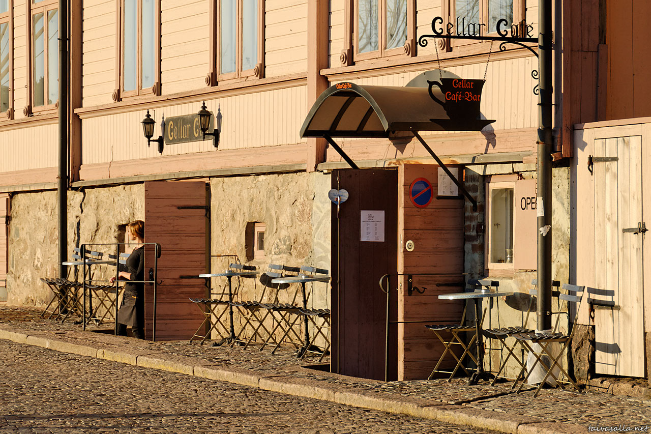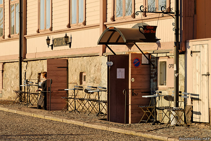 Porvoo: Puutalon kivijalassa toimiva kahvila ilta-aurinkoisella Jokikadulla Vanhassa Porvoossa.