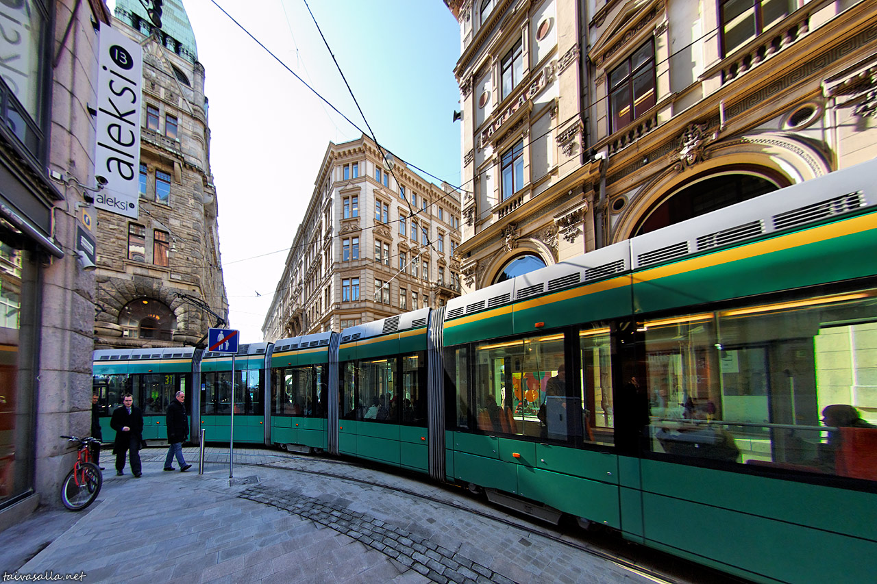 Helsinki: Linjan 3T raitiovaunu kääntymässä Mikonkadulta Aleksanterinkadulle uuden rataosuuden kolmantena liikennöintipäivänä. Edellinen kuva esitti samaa risteystä vastakkaisesta suunnasta.
