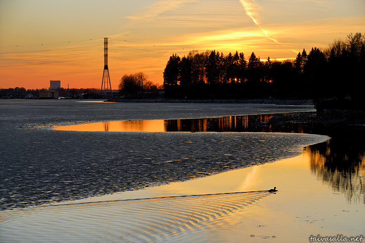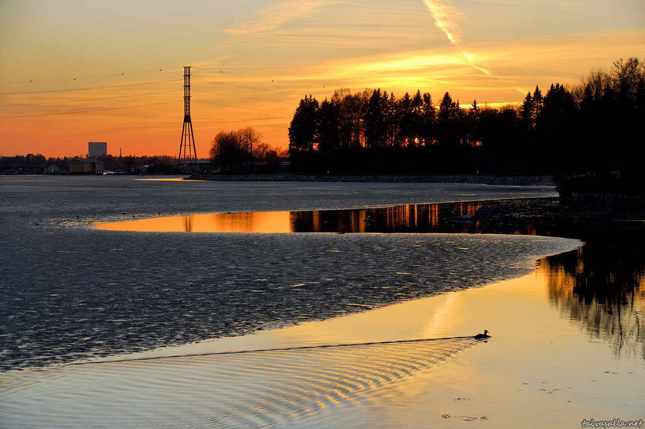 Helsinki: Sinisorsa uiskentelee Lapinlahden kiemurtelevaa pohjoisrantaa myötäilevässä sulassa Hietaniemen hautausmaan vieressä. Kuvattu kauniin kevätpäivän iltana auringonlaskun aikaan.