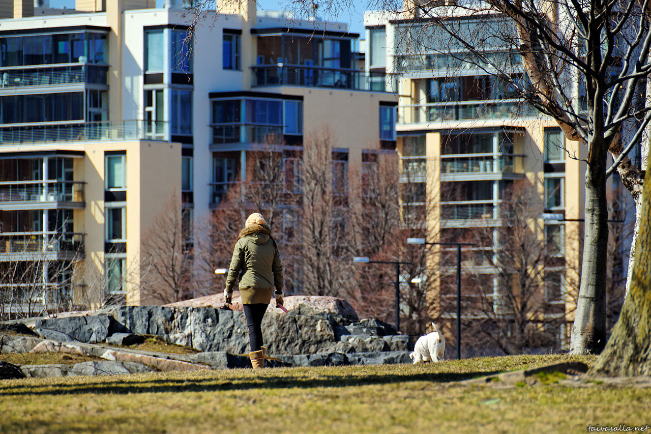 Helsinki: Eiranrannan uudet asuintalot kohoavat Ursininkalliolla Eirassa koiraansa ulkoiluttavan naisen takana.