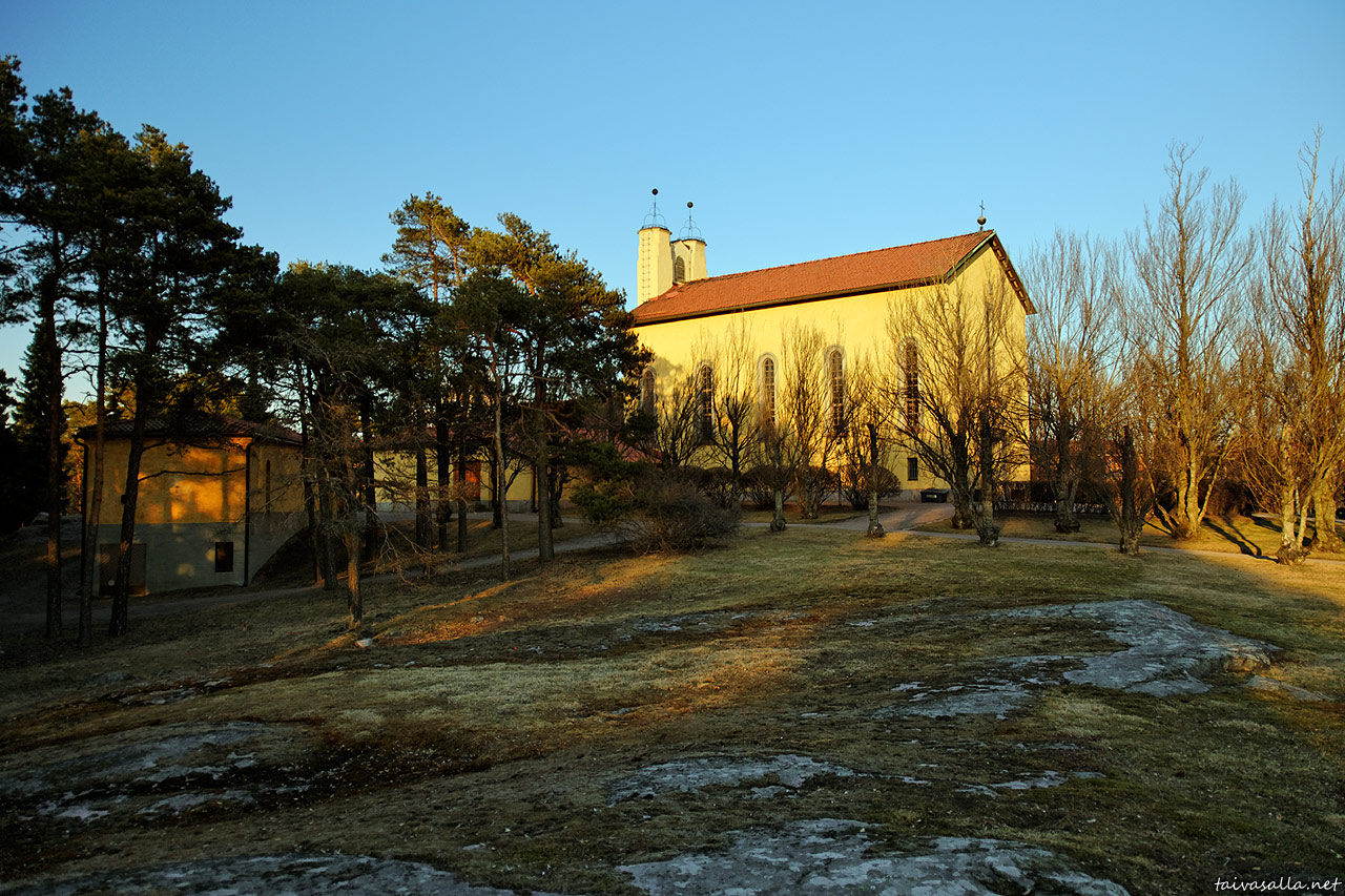 Helsinki: Hietaniemen krematoriokappeli Etu-Töölössä kylpee ilta-auringon valossa.