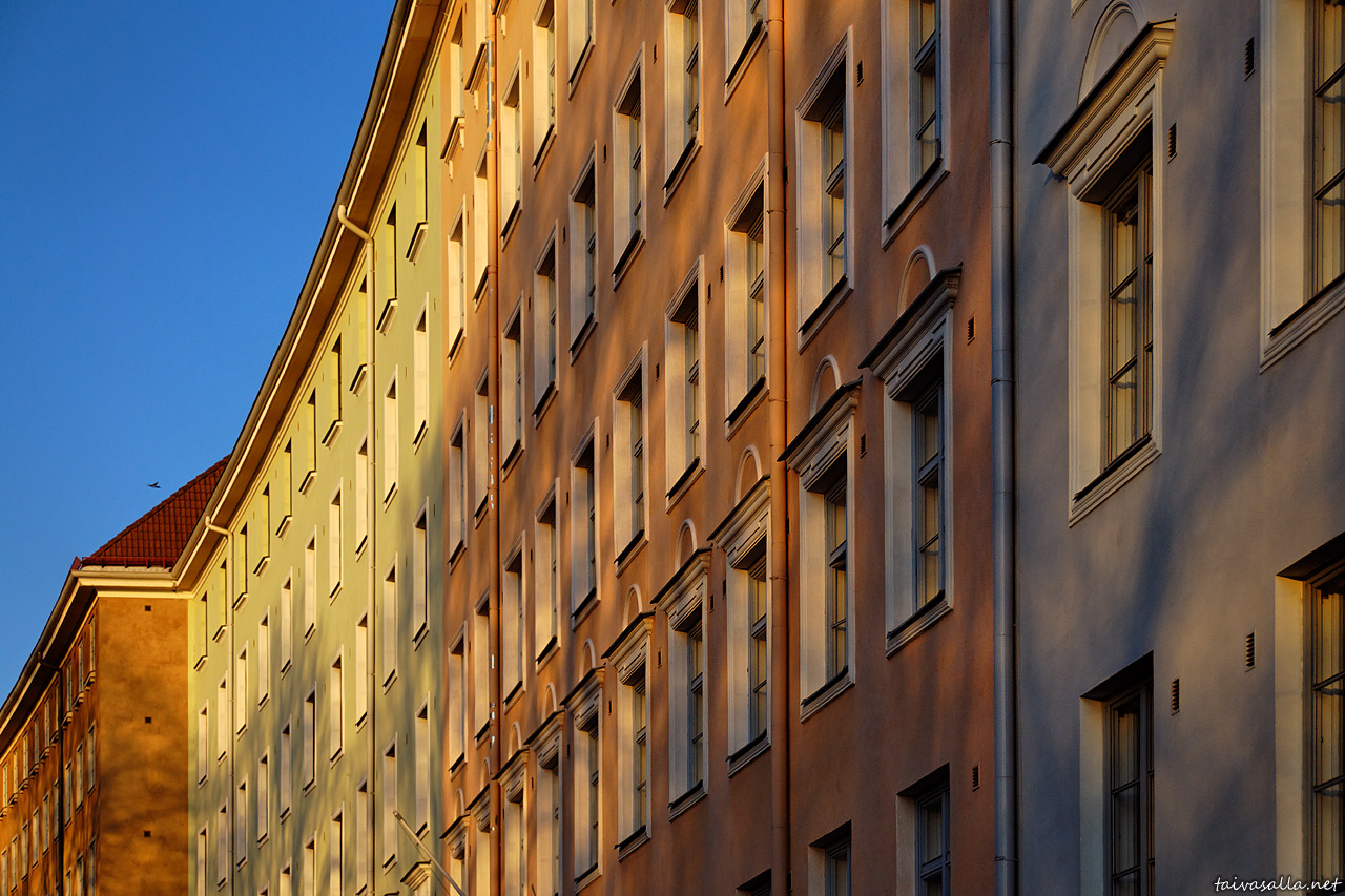 Helsinki: Pastellisävyisiä julkisivuja Eteläisellä Hesperiankadulla (talot 26-32) Etu-Töölössä. Hesperiankatujen välisten puiden varjot lankeavat ilta-auringon valaisemille seinille. Kuvassa näkyvät talot ovat osa Sonckin korttelia.