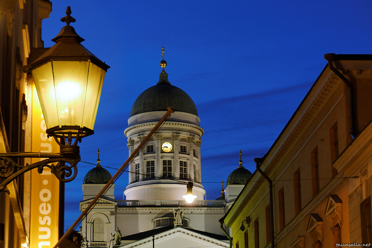 Helsinki: Hämärtyvän kevätillan näkymä Sofiankadulta Kruununhaasta kohti Tuomiokirkkoa.